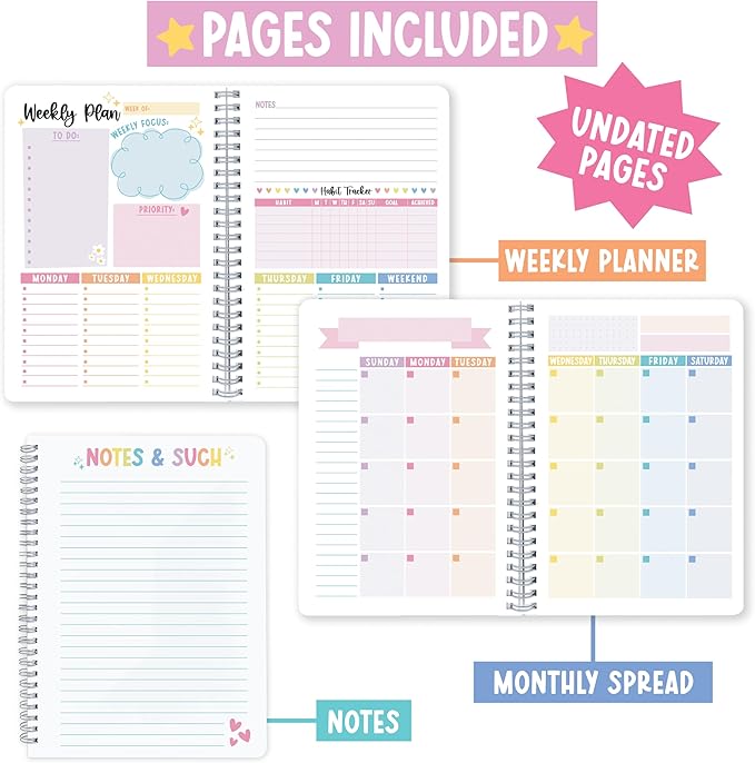 Undated Planner Weekly and Monthly - Spiral Undated Weekly Planner for Kids & Adults, Week Planners Habit Tracker, Goal Planners Notebook for Work, Agenda Planning Notebook